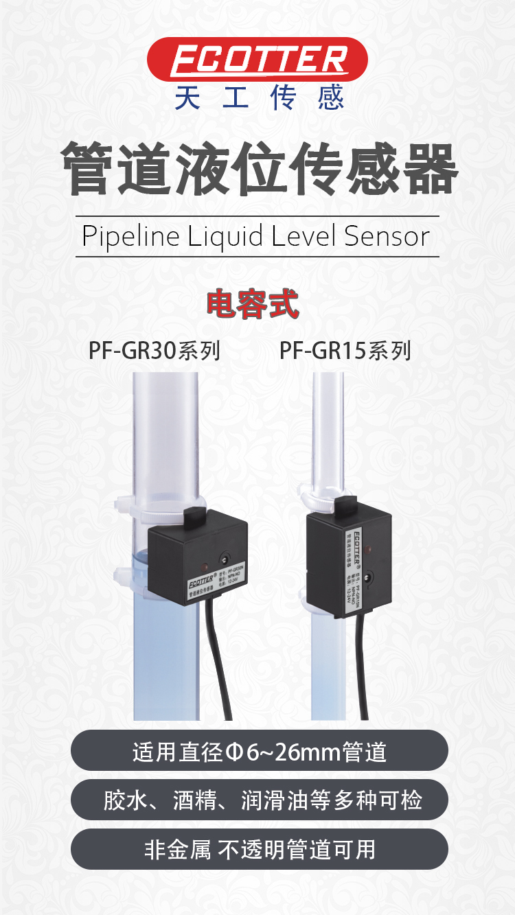 ECOTTER 電容式管道液位傳感器 PF-GR系列 由天工傳感 自主研發(fā),根據(jù)靜電容原理設(shè)計(jì),所以它可以檢測(cè)非透明管道里面的液體情況,如橡膠管、鐵氟龍管、PVC管、陶瓷管等。