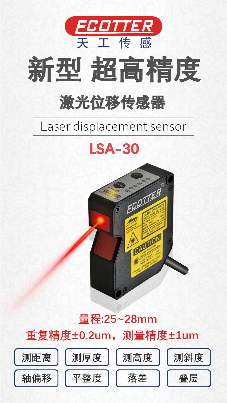 ECOTTER 新型 超高精度激光位移傳感器 LSA-30 是一種利用激光技術(shù)進(jìn)行測(cè)量的傳感器,它能夠非接觸地精確測(cè)量被測(cè)物體的位置、位移等變化,LSA-30 的量程:25~28mm,重復(fù)精度:±0.2um,線性度精度:±1um。