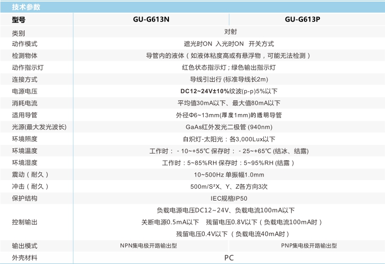 ②如導管內(nèi)有液體,投光部發(fā)出的光將穿透液體,不進入受光元件。(遮光狀態(tài))