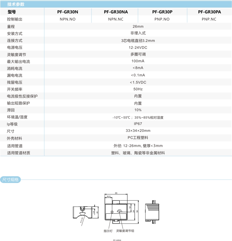 電容式液位傳感器是根據(jù)靜電容原理設(shè)計(jì),所以它可以檢測(cè)非透明管道里面的液面情況,如橡膠管、鐵氟龍管、PVC管、陶瓷管等。