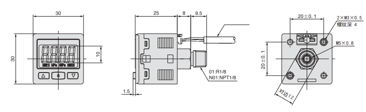 壓力傳感器的外形小巧,正面為L(zhǎng)CD顯示和三個(gè)操作按鍵;背面為電源接入口和氣壓接入口。