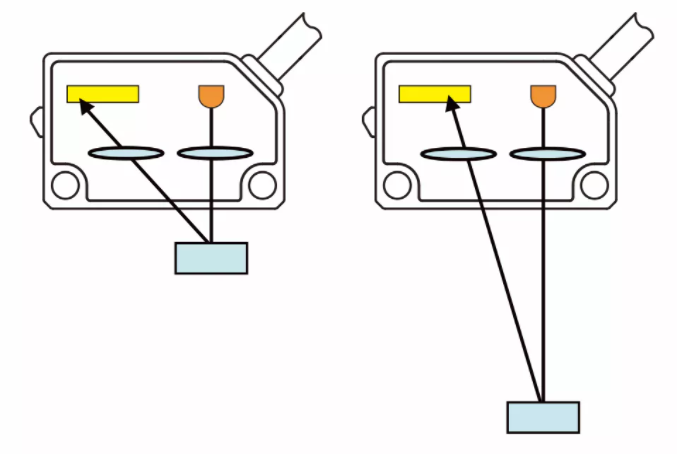 如下圖,物體在距離傳感器不同的位置,反射光線照在受光元件的位置也不同。