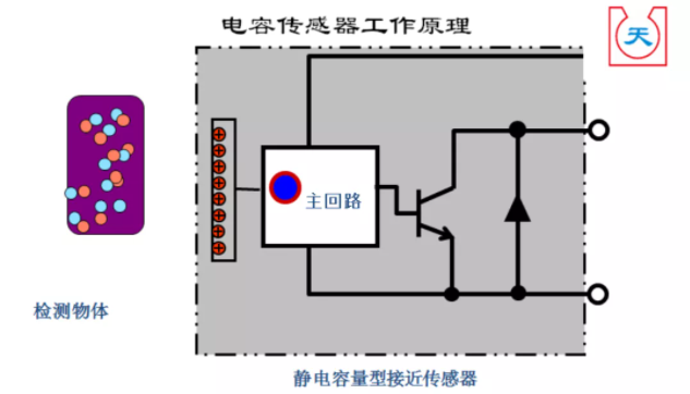 物體接近傳感器時(shí),電容容量發(fā)生改變,從而改變了原電路穩(wěn)態(tài),電路轉(zhuǎn)換觸發(fā)輸出。
